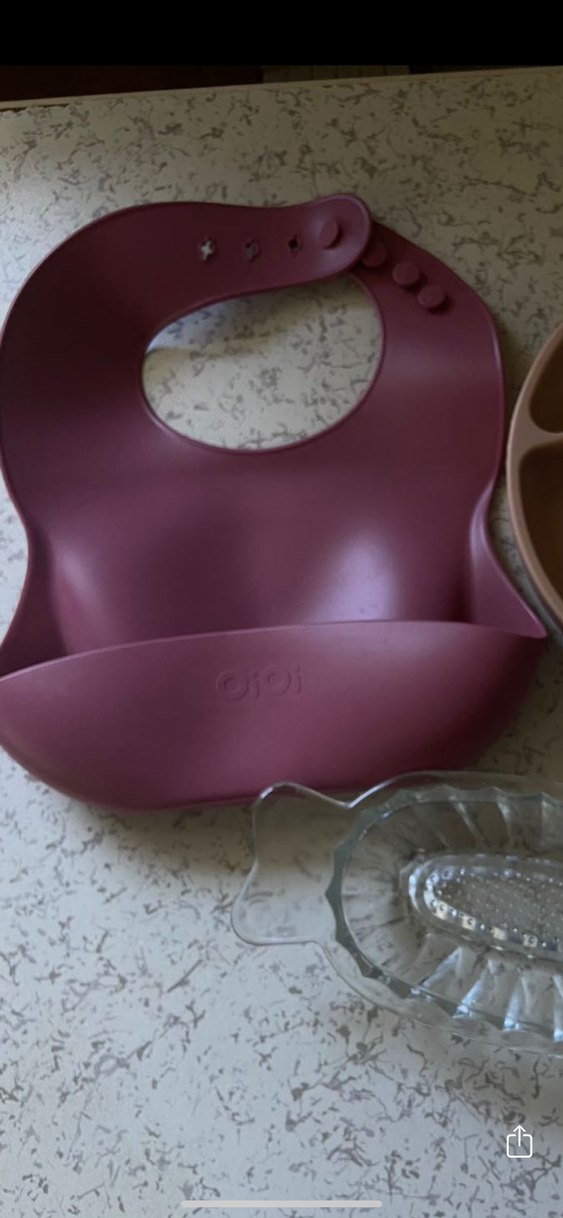 Ayarlanabilir düğmeli yakası ve derin cepli, yumuşak ve esnek malzemeden bordo renkli bebek önlüğü.