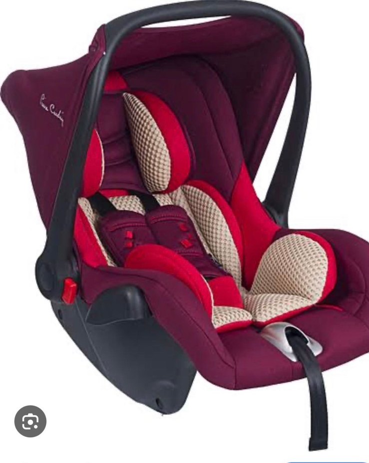 Bordo bebek oto koltuğu, bej yastıklı desteklerle ve ayarlanabilir taşıma sapı ile konfor sağlar. Seyahatlerde bebek güvenliği için uygundur.