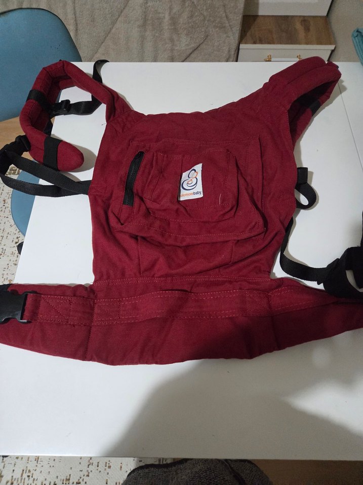Bordo renkli bebek taşıma aparatı, ayarlanabilir kayışlar ve ön cep içerir. Bebek taşıma için güvenli ve rahat destek sağlar.