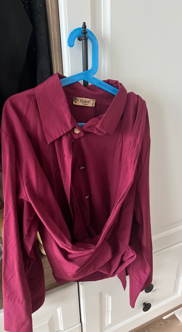 Bordo renkli kadın gömlek, yakalı ve uzun kolludur. Düğmeli ön kısmı ve bol kesimiyle rahat bir kullanım sunar. İpek gibi yumuşak kumaştan üretilmiş, midi boyda günlük kullanıma uygundur. Minimalist ve şık tarz için idealdir.