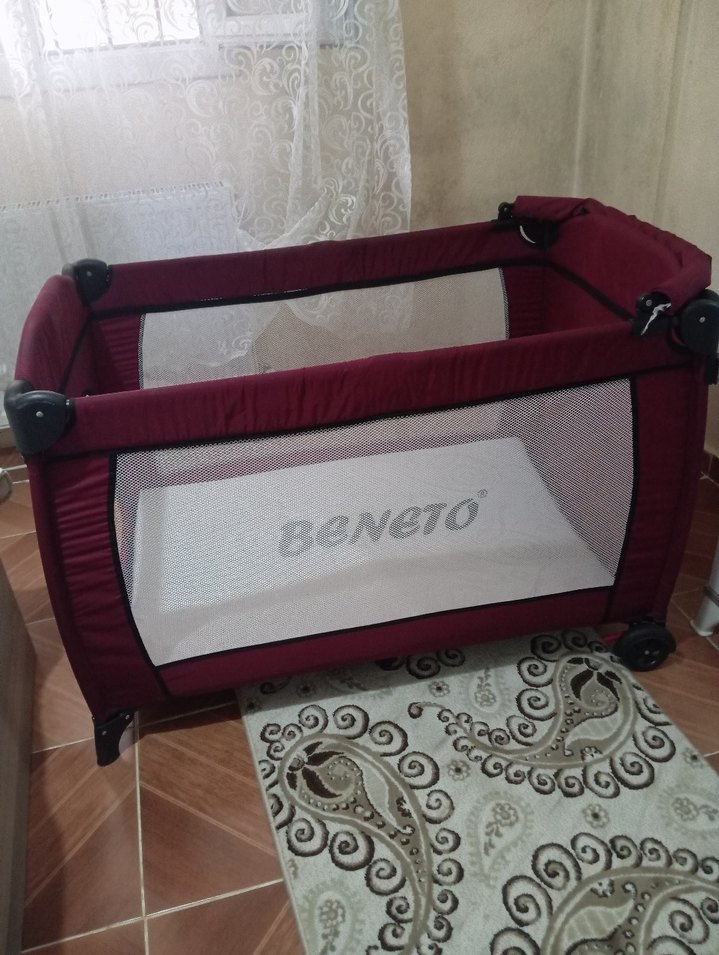 Bordo renkli, file yanlı ve "BENETO" yazılı yumuşak minderli oyun parkı yatağı. Güvenli ve rahat kullanım sağlar. ️e l d n t slm olur söke aydın