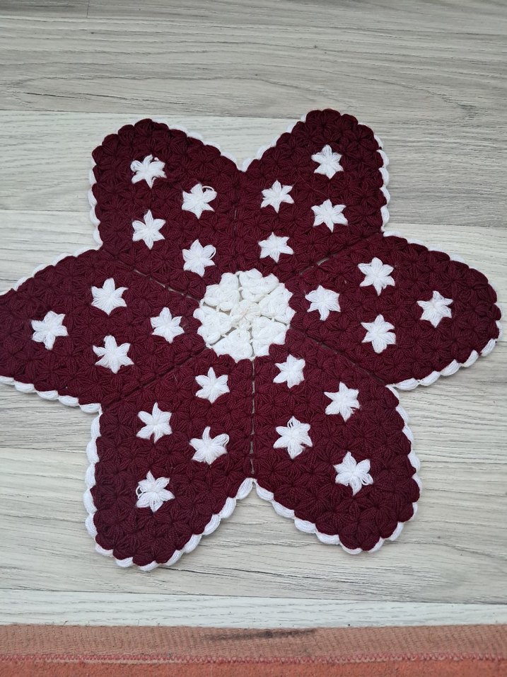 Bordo ve beyaz renklerde, çiçek motifli el örgüsü supla. Altı yapraklı ve yıldız desenli, geleneksel tarzda masa dekoru için uygun.