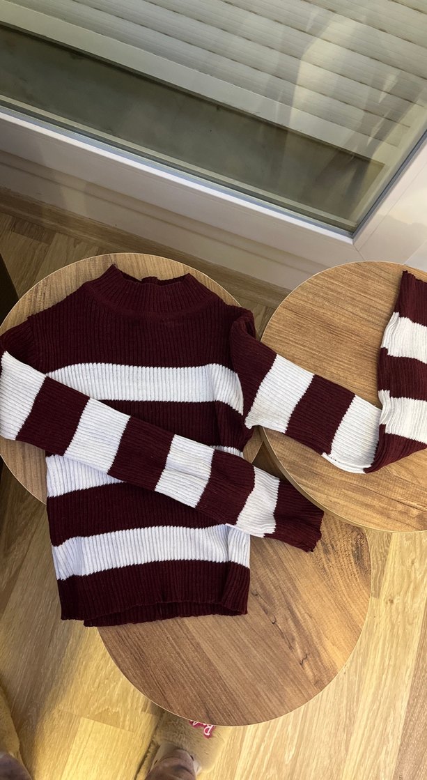 Bordo ve beyaz çizgili, uzun kollu, boğazlı ve fitted kesim örme kadın kazak. Rahat ve şık, günlük kullanıma uygun. Ürünün boyu 42 cm’dir