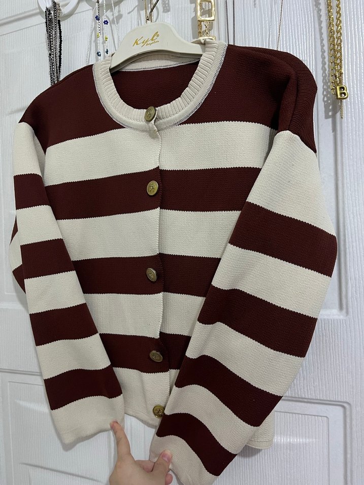 Düğmeli, bordo ve beyaz geniş çizgili kadın hırka. Yuvarlak yaka ve uzun kollu, rahat kesim. Örgü kumaştan, günlük kullanıma uygun sıcak tutar.