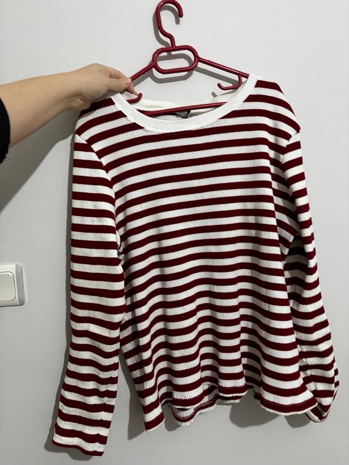 Bordo ve beyaz çizgili, pamuklu kadın triko kazak. Uzun kollu, yuvarlak yaka ve bol kesim rahat bir günlük stil sunar.