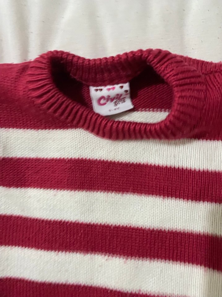 Bordo ve beyaz çizgili, uzun kollu, yuvarlak yaka, vücuda oturan kız kazağı. Yumuşak örme kumaştan yapılmıştır ve sokak stiline uygundur.
