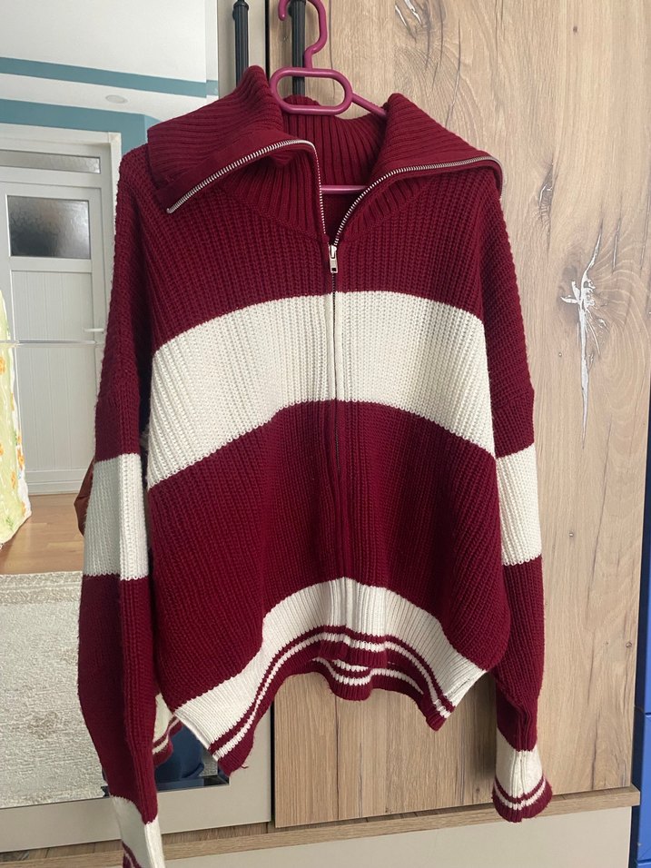 Bordo ve beyaz çizgili, uzun kollu, yüksek yakalı, fermuarlı örgü kadın kazak. Salaş kesim, midi boy, günlük sokak stiline uygun.