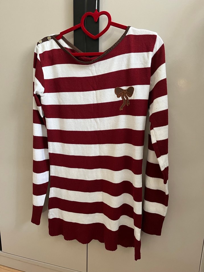 Bordo beyaz çizgili, ince triko kumaştan, uzun kollu ve midi boyda, göğüste küçük fiyonk detaylı, dar kesim kadın sweatshirtü.