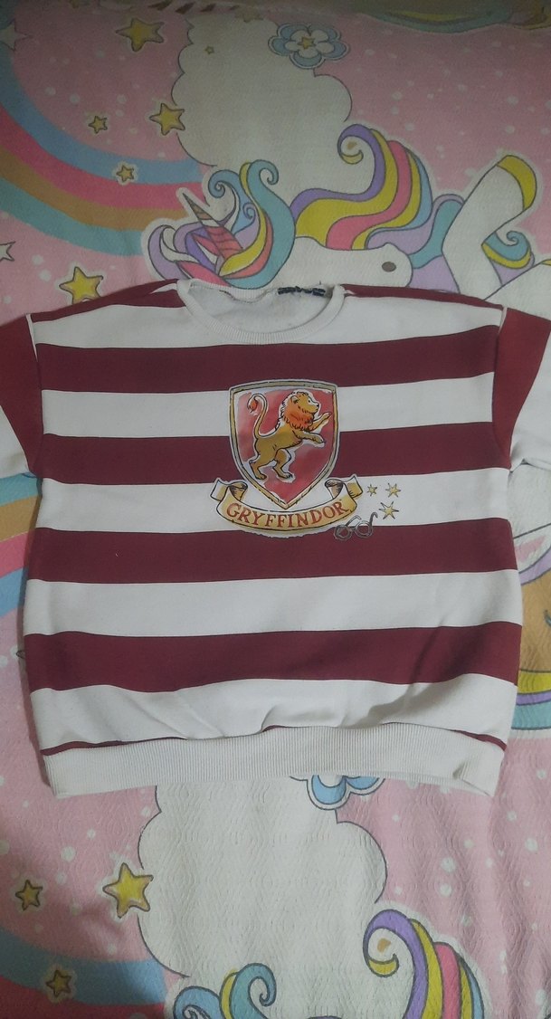 Bordo beyaz çizgili, yuvarlak yakalı ve uzun kollu kız tişörtü. Pamuklu kumaştan, bol kesim ve Gryffindor baskılı, düğmeli detaylıdır.