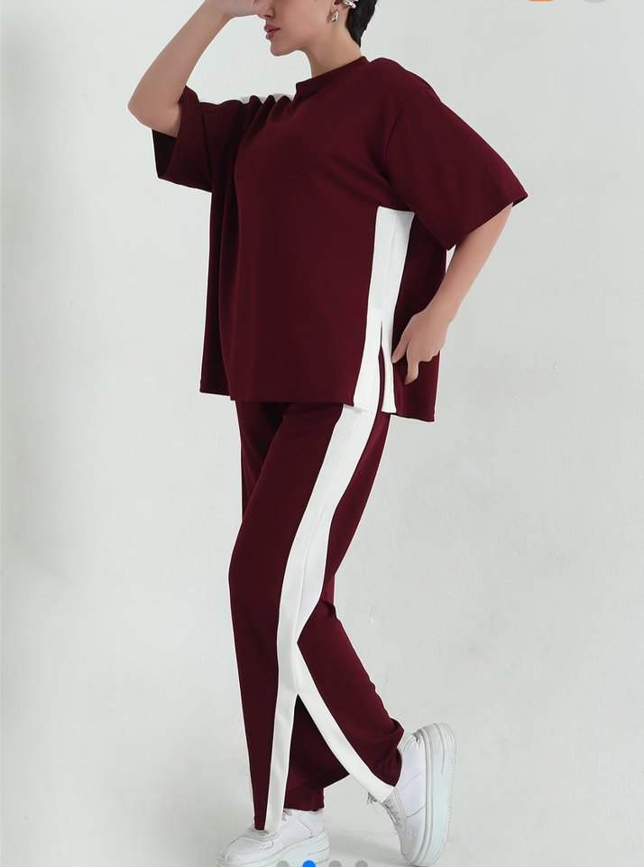 Bordo Beyaz Şeritli Rahat Kadın Eşofman Takımı