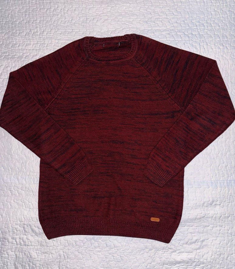 Bordo renkli, bisiklet yaka ve uzun kollu erkek triko kazak. Rahat kesimi ve normal boyu ile günlük kullanıma uygundur.