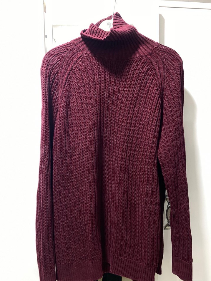 Bordo renkli, boğazlı ve uzun kollu örgü kazak, bol kesimiyle rahat ve günlük kullanıma uygun bir parça.