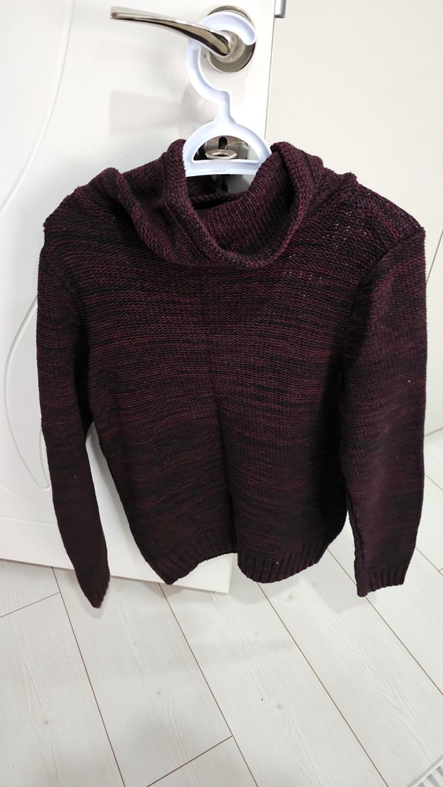Bordo renkli, boğazlı ve uzun kollu örgü erkek kazak. Rahat kesimi ve sade deseniyle günlük sokak stiline uygun, konforlu bir parça.