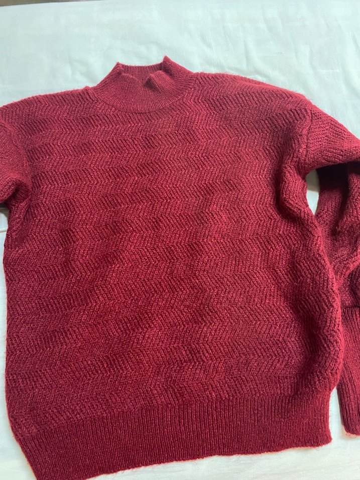Bordo renkli, boğazlı ve uzun kollu örgü kadın kazak. Normal boyda, bol kesim ve parlak dokusuyla rahat bir günlük kullanım sunar.