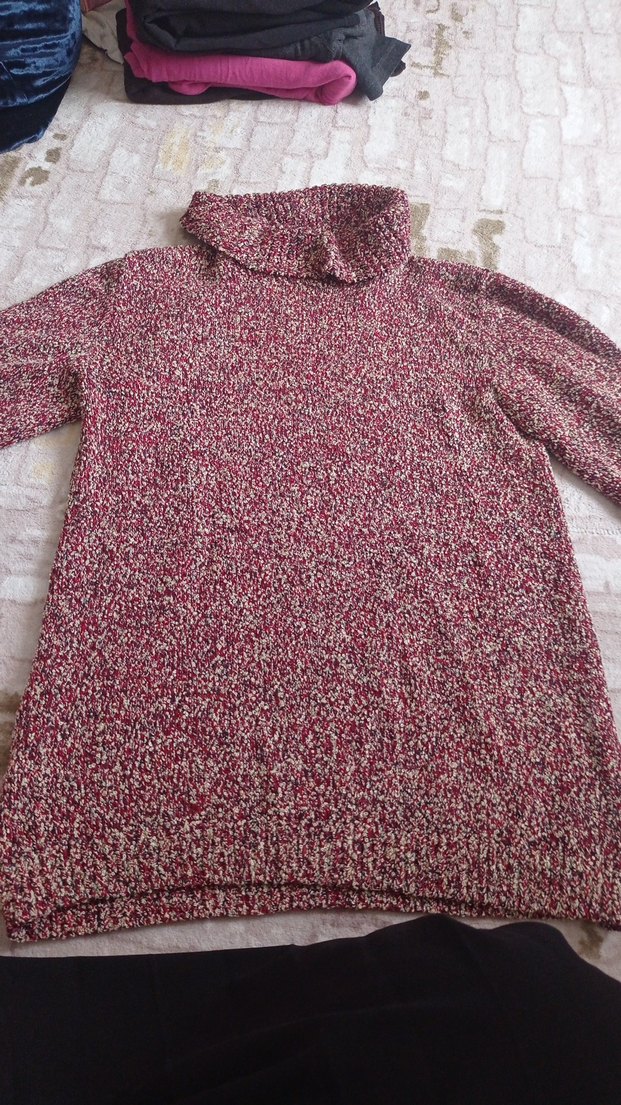 Bordo renkli, boğazlı ve uzun kollu örgü kadın kazak, rahat kesimi ve midi boyuyla günlük kullanıma uygundur.