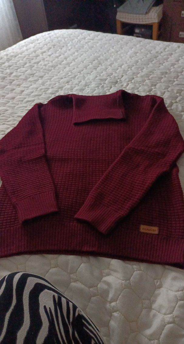 Bordo renkli, boğazlı ve uzun kollu, triko erkek kazak, günlük rahat kullanım için uygundur. M-L bedene uygun hiç kullanılmadı hiç bir sıkıntısı yoktur