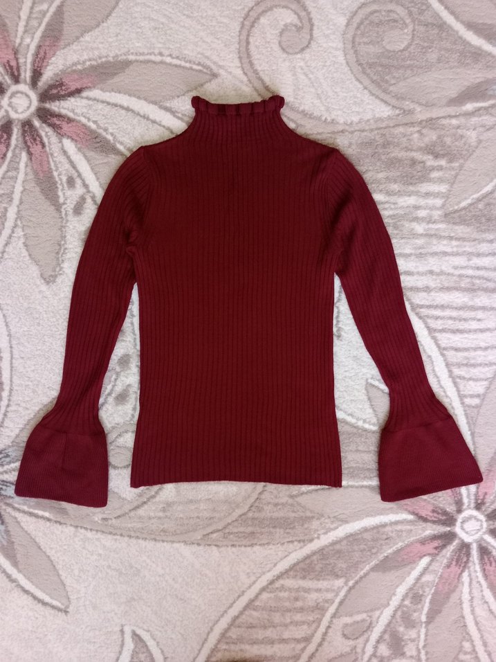 Bordo boğazlı, uzun ve geniş kollu, triko kumaştan yapılmış, vücuda oturan kadın kazak. Rahat sokak stili için uygun.
