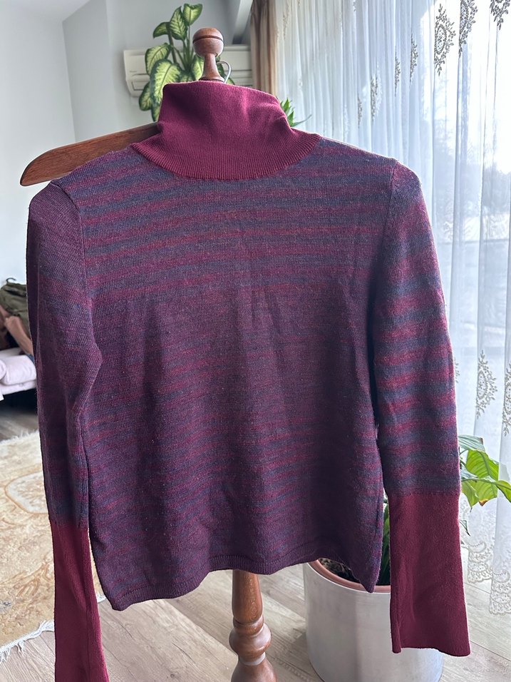 Fitted kesim, boğazlı ve uzun kollu kadın kazak. Yumuşak yün kumaştan, koyu bordo renkte, günlük kullanıma uygun rahat bir model. Boy: 55cm Kol: 61cm