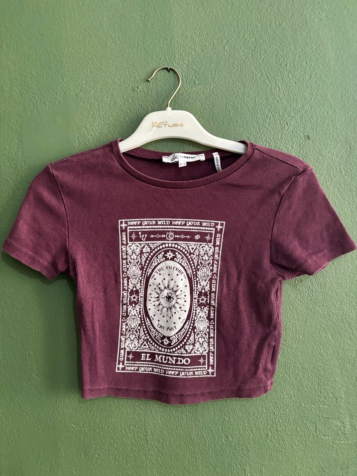 Bordo renkli, baskılı bohem desenli kısa kollu, yuvarlak yakalı, vücuda oturan kumaş tişörttür. Günlük kullanıma uygundur.