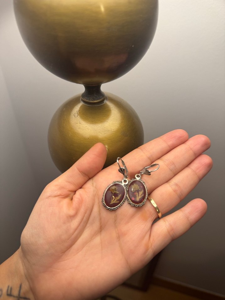 Bordo renkli, bohem tarzda, çiçekli ve gerçek kurutulmuş desenli küpeler. Vintage esintili, normal uzunlukta ve romantik akşamlar için uygun.