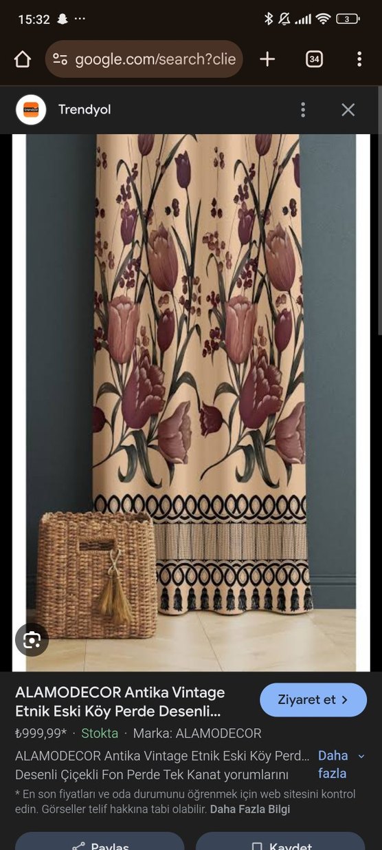 Bordo renkte, bohem tarzda koyu renkli çiçek desenleri bulunan fon perde. Detaylı bordürleriyle vintage bir hava katıyor.