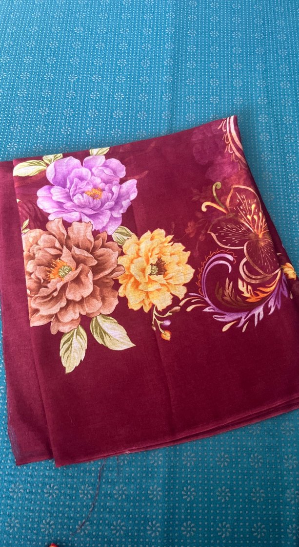 Bordo sentetik kumaştan, çiçek desenli ve bohem tarzını yansıtan drapeli kadın fular yazma