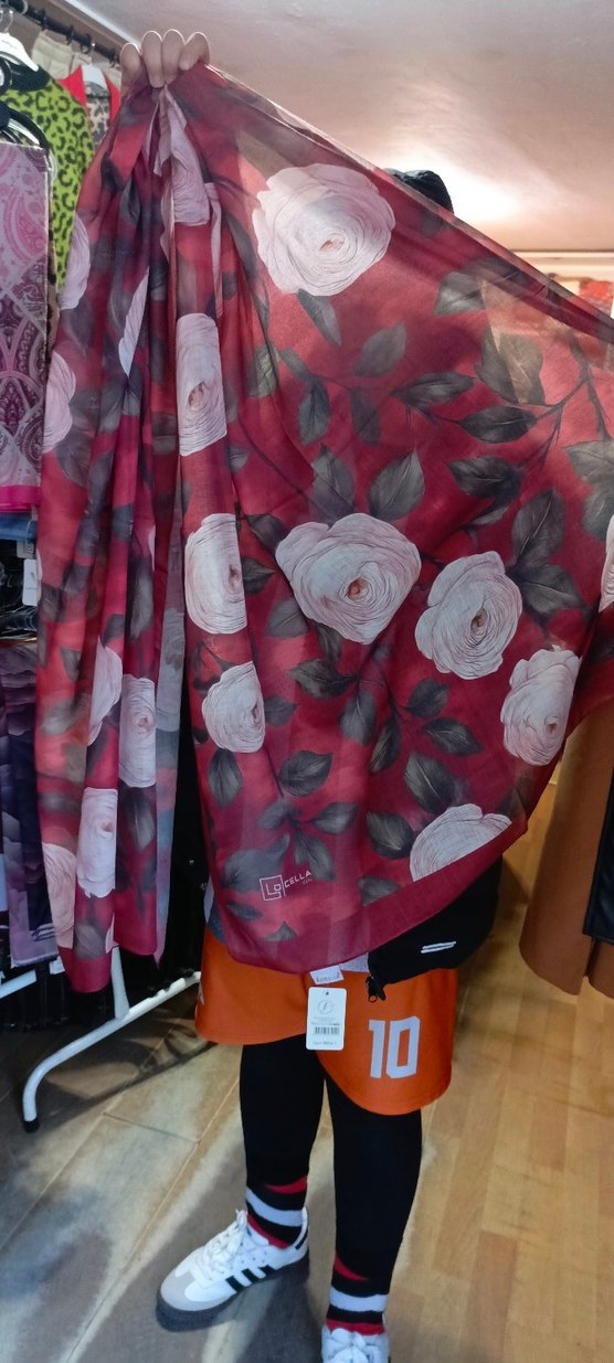 Bordo renkte, beyaz gül desenli, dökümlü şal. Yumuşak sentetik kumaştan, bohem tarzına uygun.