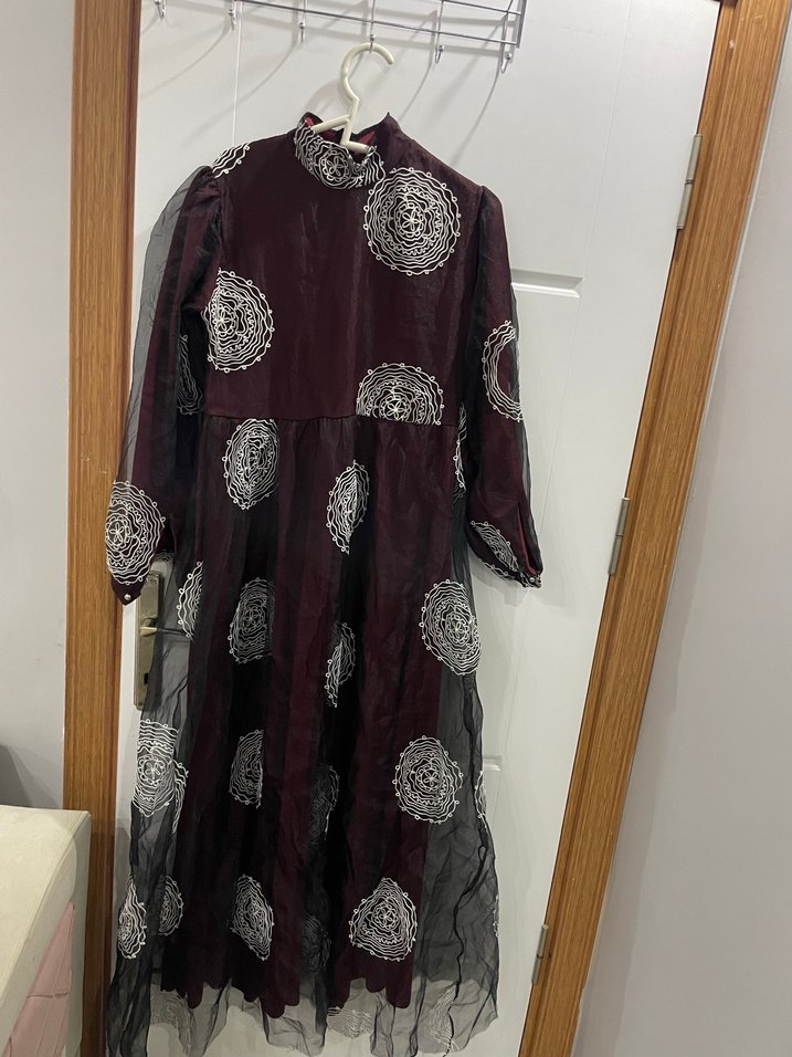 Bordo renkte, bol kesim, yüksek yakalı ve uzun kollu bu uzun elbise, bohem goth tarzında. Sentetik kumaş, dantel ve batik desen detaylarına sahip, günlük kullanıma uygun. Koli 6