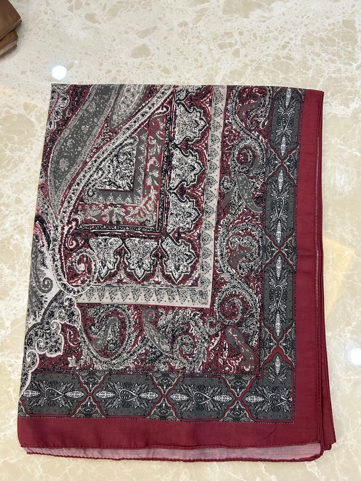 Bordo renkte, bohem desenli, drapeli kadın şalı. Sentetik kumaştan üretilmiştir.