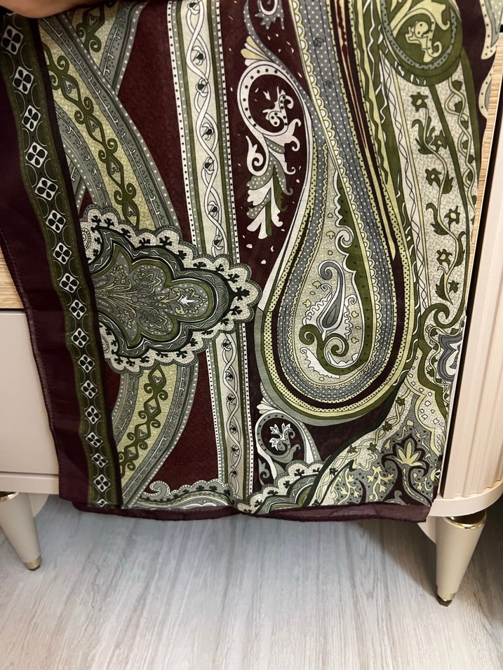 Bordo zemin üzerinde toprak tonlarında karmaşık bohem desenlere sahip, drapeli kadın şalı. Yumuşak tekstil dokusu, retro ve hippie tarzına uygundur.