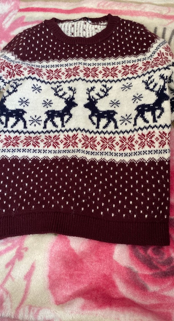 Bordo bohem desenli triko kazak, fitted kesim, yuvarlak yaka ve uzun kollu. Geyik ve kar tanesi desenleriyle günlük kullanıma uygun. ❄️