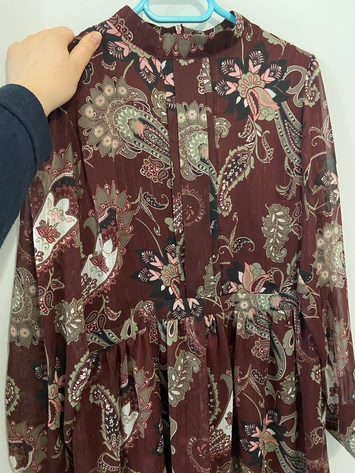 Bordo renkli, yüksek yakalı ve uzun kollu bol kesim kısa elbise. Yumuşak sentetik kumaştan, bohem desenli ve drapeli detaylara sahip, günlük kullanıma uygun.