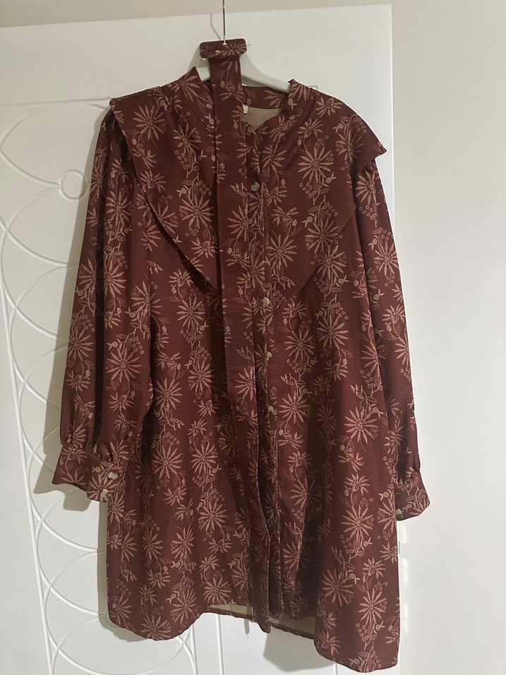 Bordo renkli, bol kesim, uzun kollu ve yakalı gömlek Desenli ve düğmeli olup, günlük kullanıma uygun bohem vintage tarzındadır.