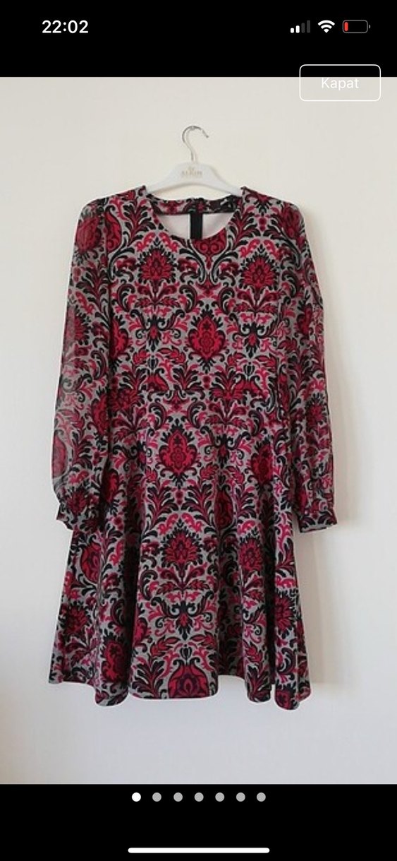 Bordo renkli, uzun kollu, bohem desenli kız elbisesi. Yuvarlak yaka ve fırfır detaylı, yumuşak sentetik kumaştan, bol kesim. Kolları tül