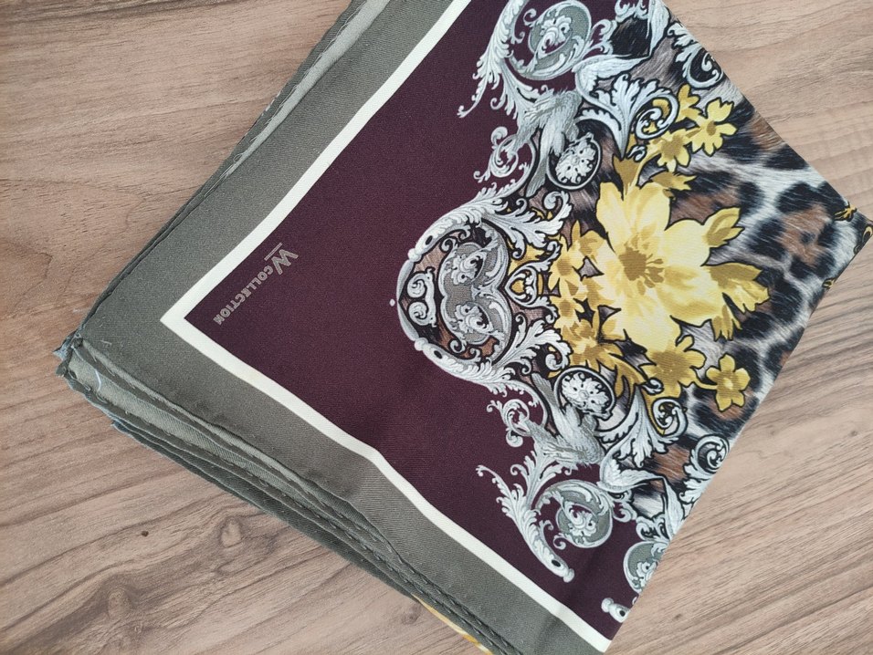 Bordo renkte, gri ve sarı tonlarında vintage bohem desenlere sahip, yumuşak sentetik kumaştan yapılmış kadın fular, drapeli tasarım sunar.