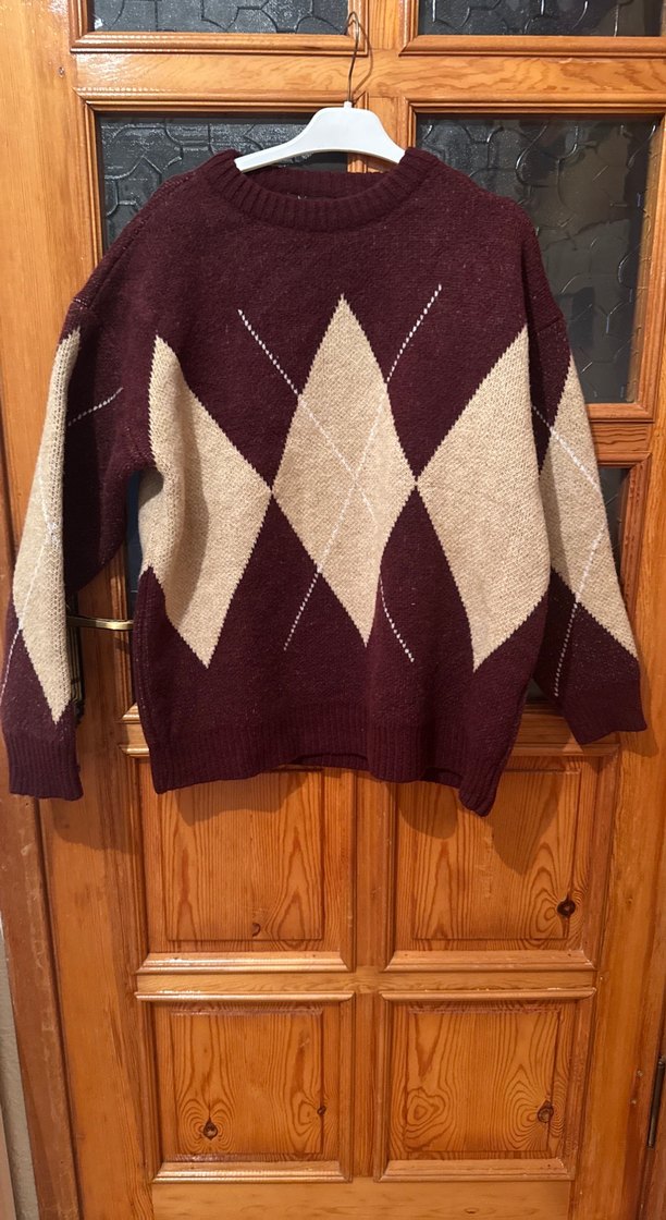 Bordo renkli, büyük bej elmas desenli, uzun kollu ve yuvarlak yaka bohem tarzda gevşek örgü kadın kazak. Rahat ve sıcak dokusu ile günlük kullanıma uygun.