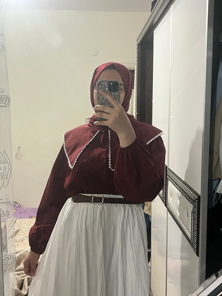 Bordo renkli, pamuklu, uzun kollu ve yakalı kadın bluzudur. Salaş kesimi, etnik deseni ve drapeli tasarımıyla mütevazı bohem tarzı yansıtır.