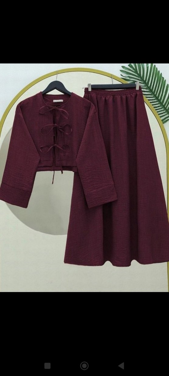 Bordo renkte, bol kesim uzun etek ve bağcıklı kısa üstten oluşan bohem tarzda kadın elbise takımı. Minimalist ve şık görünüme sahiptir. 44 beden son 1 adet kaldı.