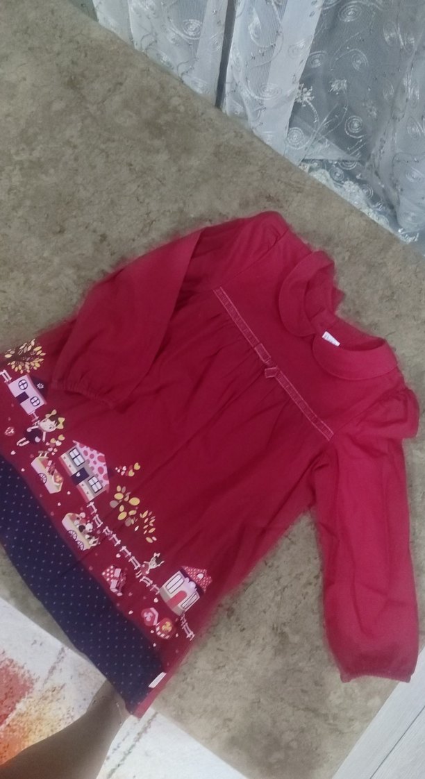 Bordo renk, uzun kollu kız çocuk elbisesi, bol kesim ve renkli baskılı desenlere sahip. Örme dokulu, yuvarlak yaka ve yumuşak, sıcak kumaftan üretilmiştir.