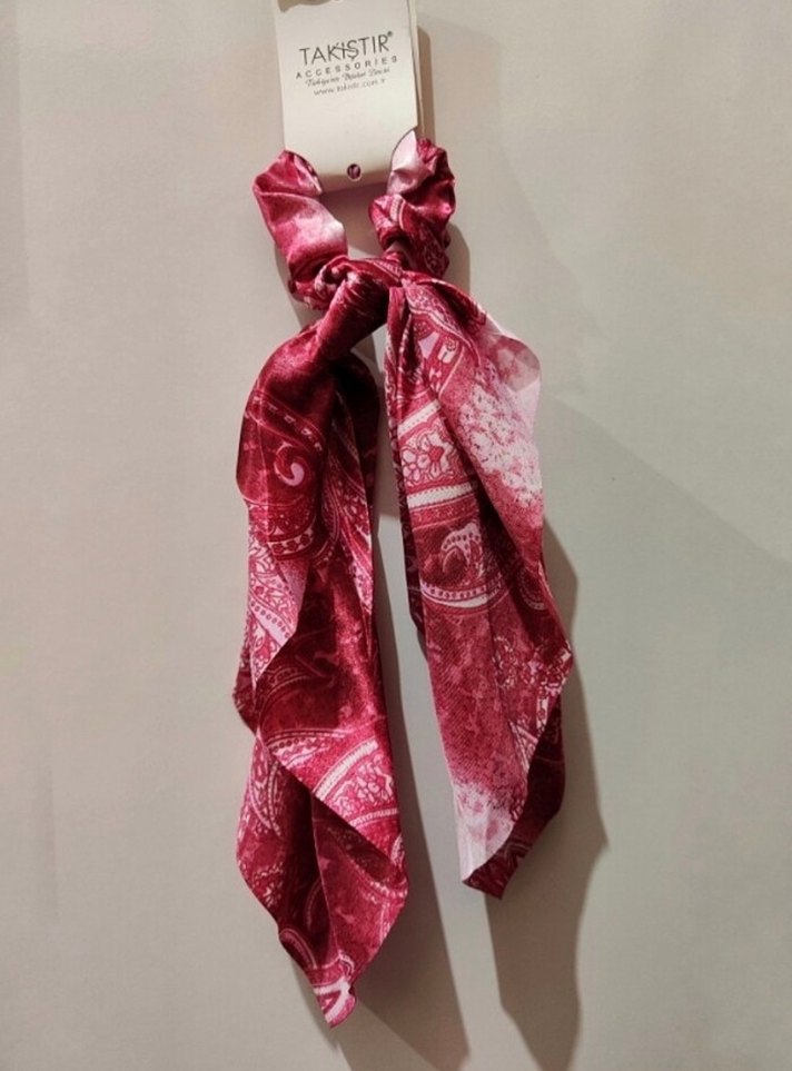 Bordo parlak sentetik kumaştan yapılmış, bohem tarzda kurdeleli saç tokası. Üzerinde TAKISTIR yazısı bulunur.