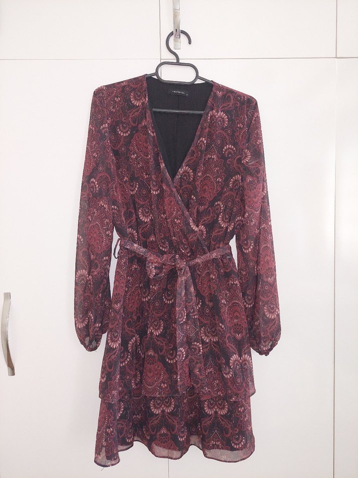 Bordo renkli, uzun kollu, bohem tarzda, midi boy ve bol kesim kadın elbisesi. Belde kuşak bulunur. Beli lastikli. Ufak bir kusur vardı terzide yaptırıldı.