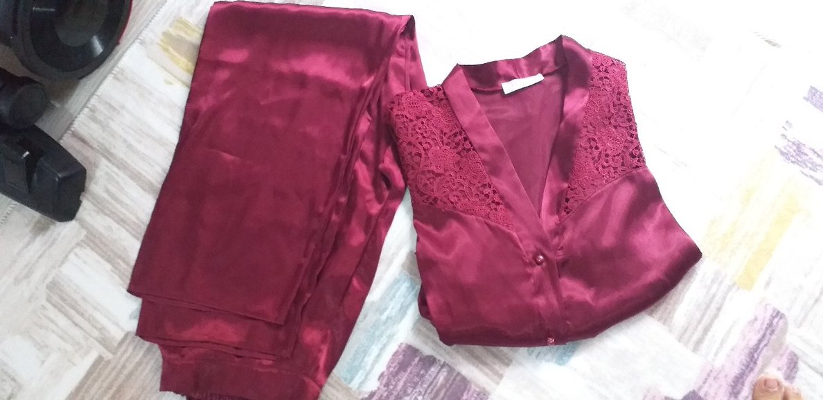 Bordo saten pijama takımı, gevşek kesim, ince askılı kollar ve dantel detaylarla bohem tarzda midi boyda, rahat bir uyku deneyimi sunar.