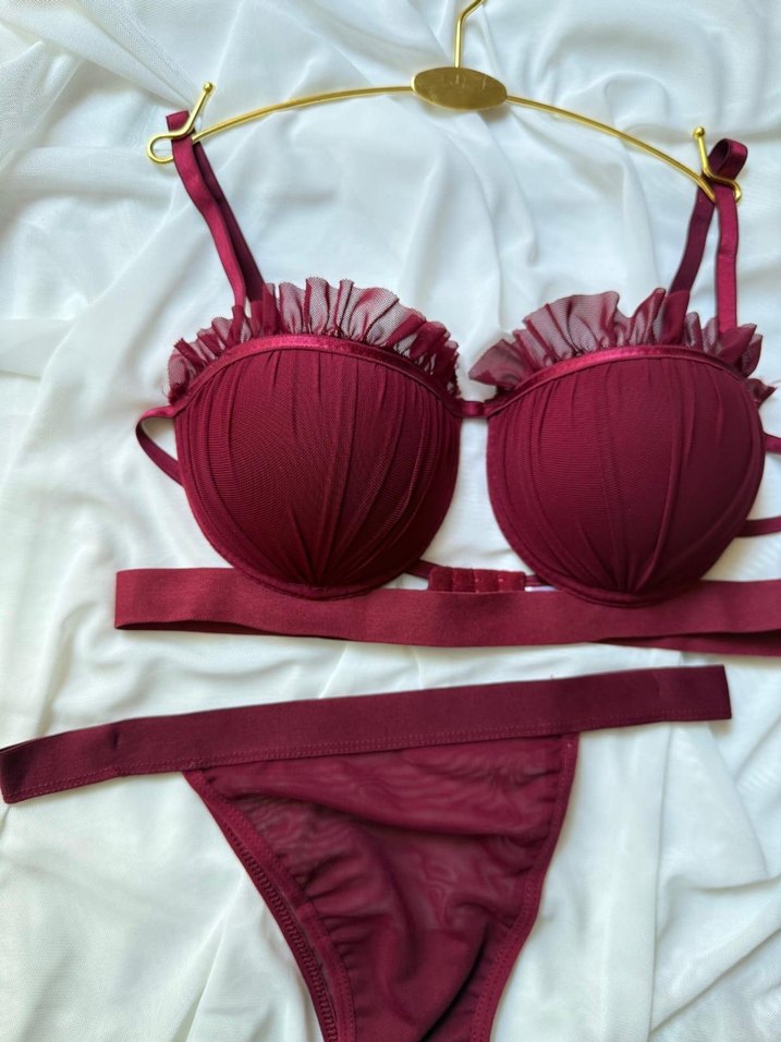 Bordo renginde, bohem tarzda, fırfırlı detaylara sahip sütyen ve uyumlu alt parçadan oluşan takım. Yumuşak kumaş ve ayarlanabilir askılar rahatlık sağlar. ❤️