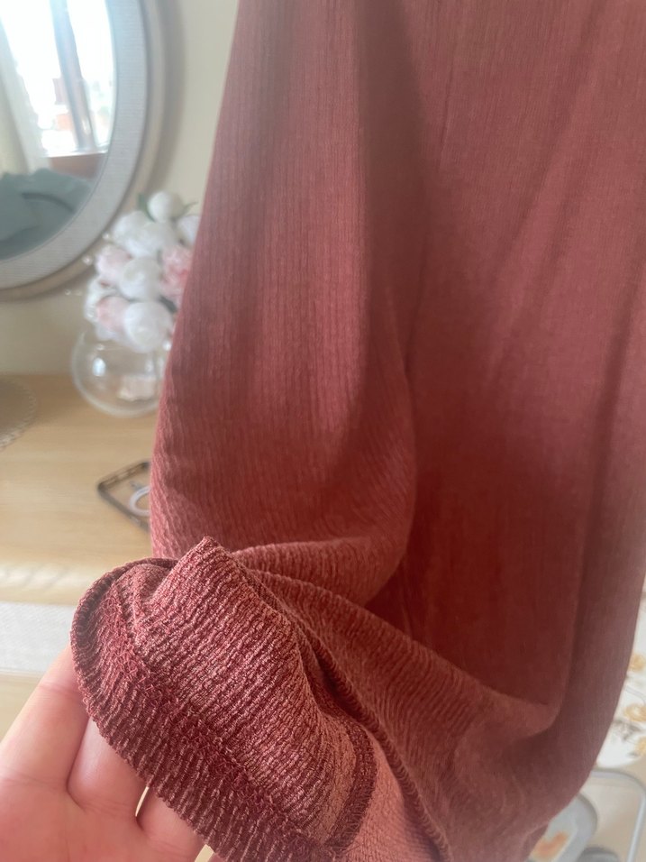 Bordo renkli, bol kesim ve pileli detaylara sahip triko elbise. Uzun kollu ve boğazlı, yumuşak keten kumaştan. Parlak dokusuyla bohem tarz sunar. Fiyat sormadan almayın