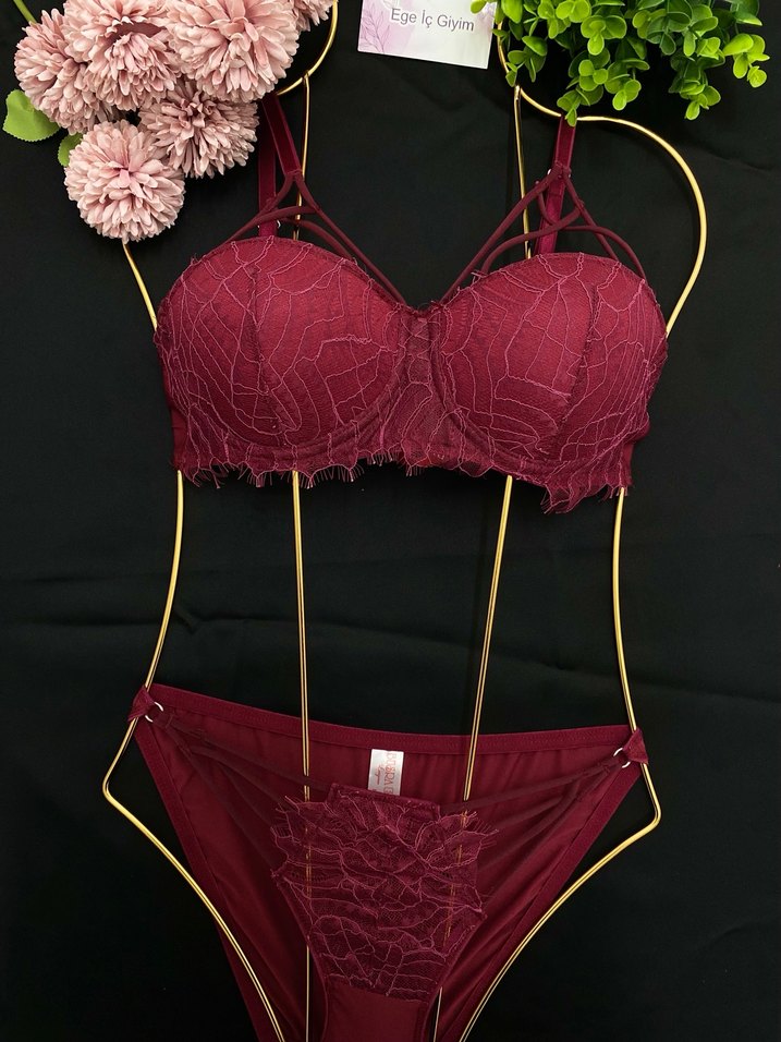 Koyu bordo renkli, bohem tarzda mini sütyen ve külot takımı. Dantel detayları ile gösterişli ve desensiz bir tasarıma sahiptir.