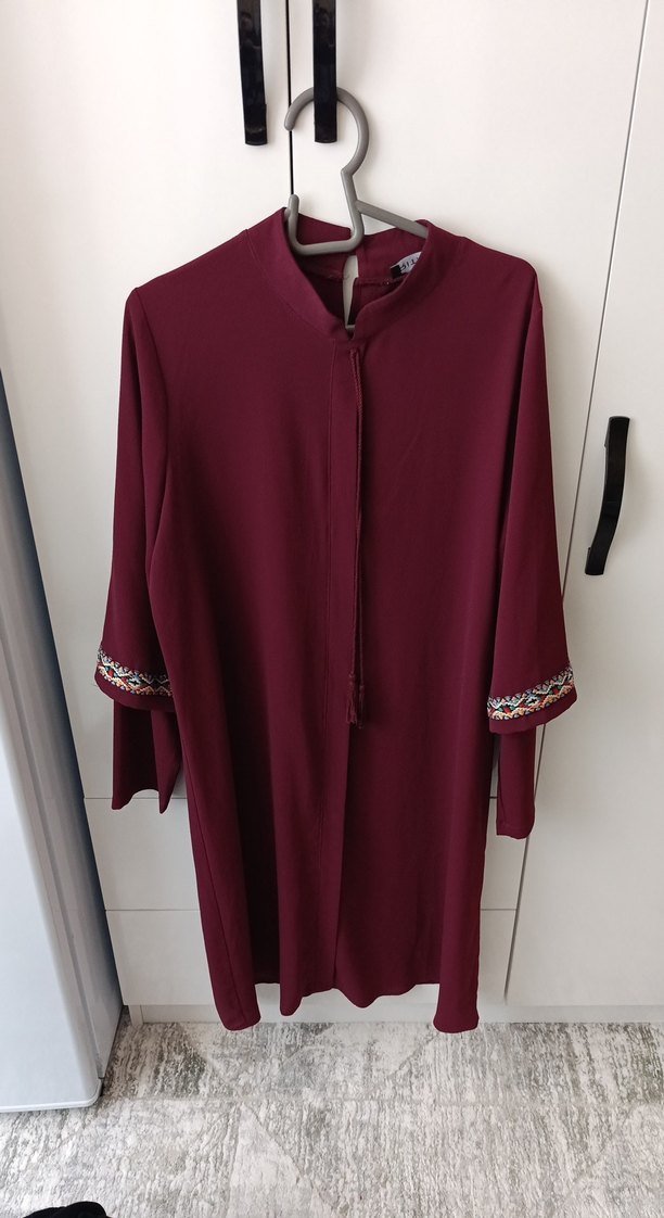 Bordo renkli, yüksek yakalı ve uzun kollu bu uzun tunik, nakışlı manşetlere ve püskül detaylarına sahiptir. Parlak sentetik kumaştan, bol kesim ve bohem tarzda.