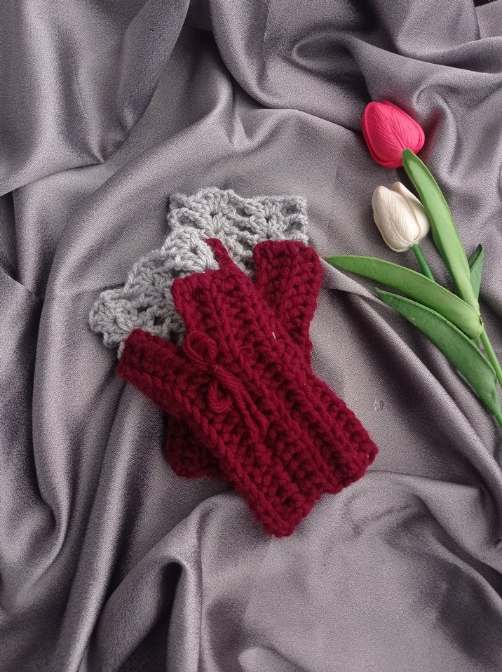 Bohem tarzda, bordo renkli örgü kadın eldivenleri. Sıcak tutan ve detaylı örgü deseniyle rahat bir görünüm sağlar. boy 20, en 10 cm dir.