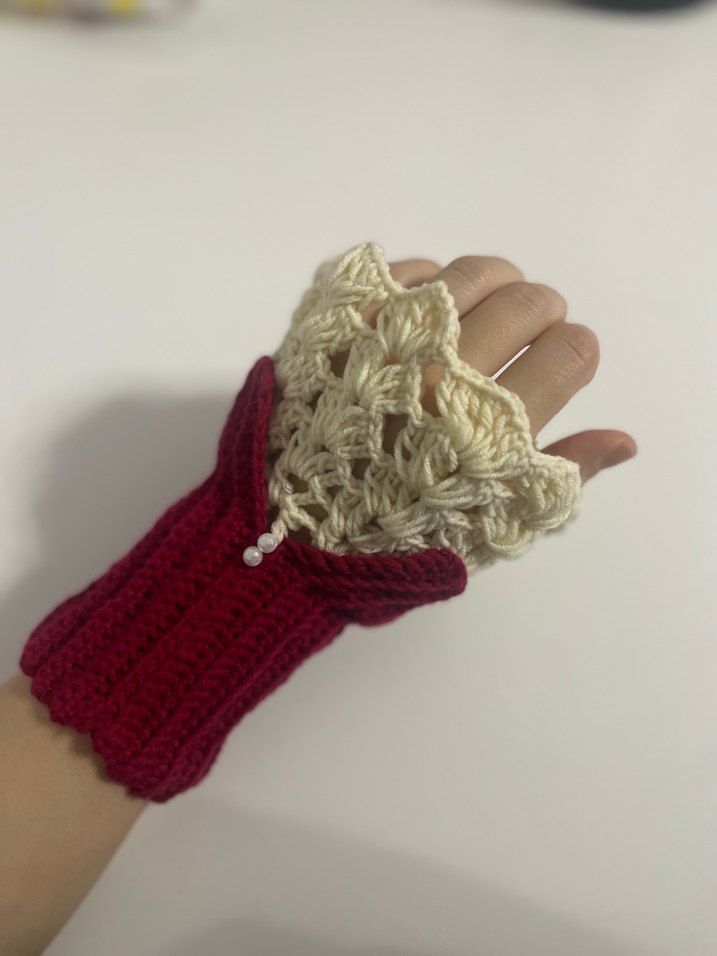 Krem dantel detaylı, inci süslemeli, bordo örgü kadın eldiveni. Rahat bohem tarzda, retro ve hippie görünüme uygundur. Tamamen el örgüsü