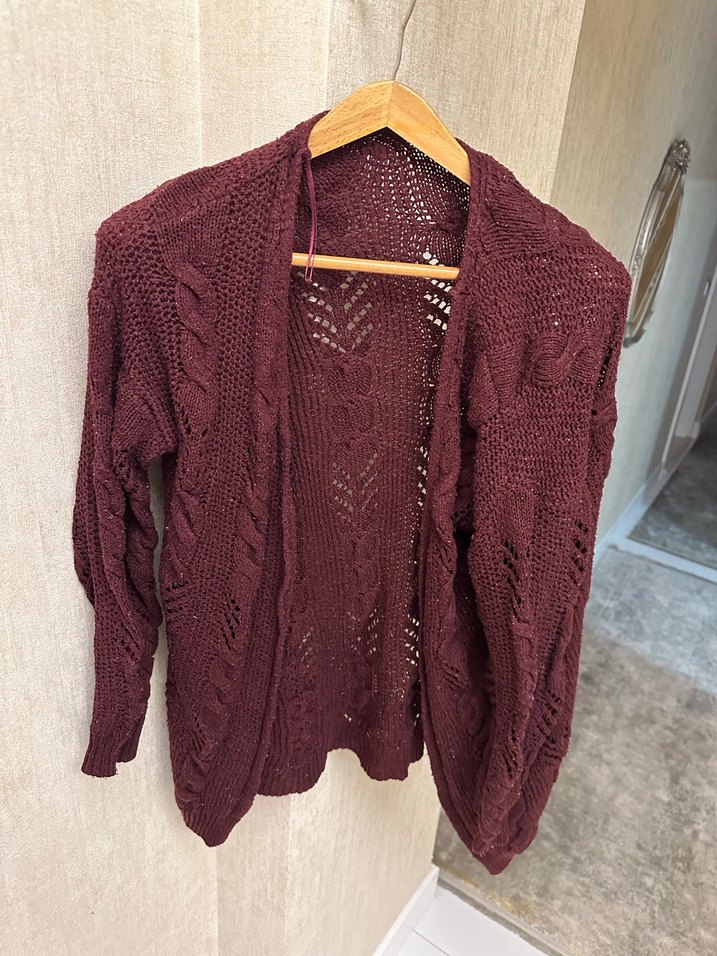 Bordo renkli, örgü dokulu, bol kesim ve uzun kollu kadın hırka. Notched lapel yakalı, midi boyda, rahat ve bohem tarzda günlük kullanım için uygundur.