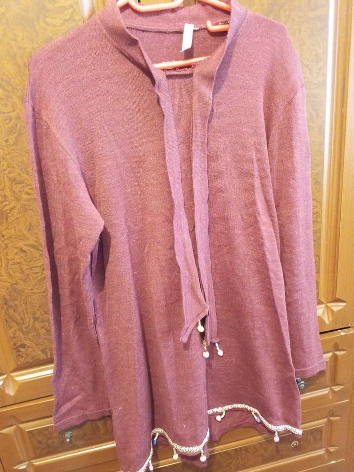 Bordo renkli, uzun kollu ve halter yaka örgü kadın kazak. Bol ve uzun kesimi, bohem tarzı ve süslemeli etek ucu detaylarıyla rahat bir model.